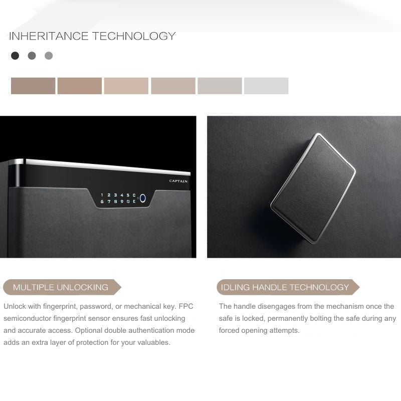CAPTAIN's LS6 Series Safebox is designed with fingerprint, password, and mechanical key unlocking. Its FPC semiconductor sensor ensures fast and accurate access, while the optional double authentication mode enhances security. The idling handle mechanism keeps the safebox securely bolted against forced entry, and a concealed compartment offers enhanced protection for your valuables. Inside, exceptional craftsmanship is reflected in the jewelry drawer, soft tailor-made compartments, sleek internal U-hinges and a stainless steel inner frame, enhancing durability and elegance. CAPTAIN's LS6 Series safe box offer timeless style and state-of-the-art security, making it the ideal choice for safeguarding your most valued possessions.