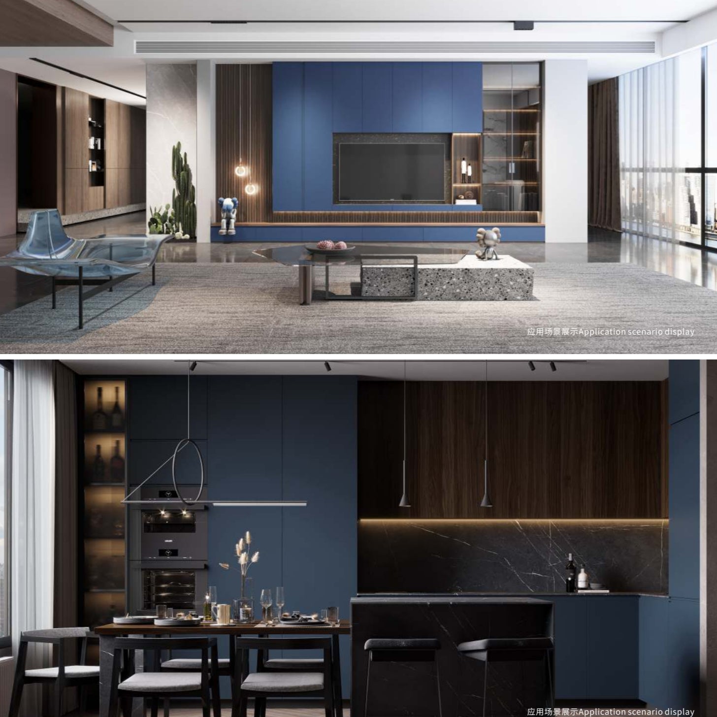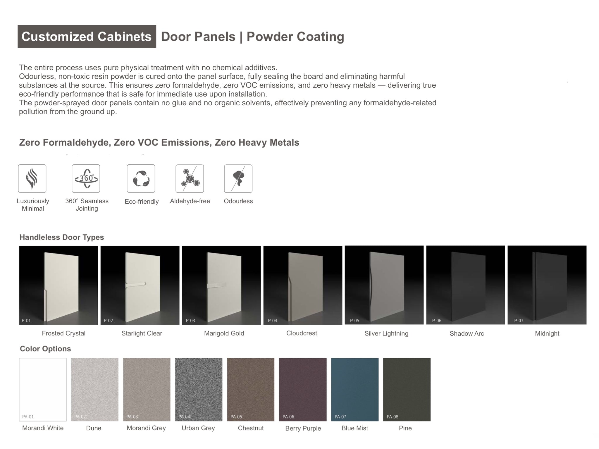 Highly favoured in contemporary wardrobe design, powder coating doors are made by applying a fine powder to a metal surface and curing it under heat to form a strong, uniform finish. The entire process is entirely physical and free from harmful chemicals. The non-toxic, odourless powder eliminates harmful substance use from the source to ensure zero formaldehyde, heavy metal, and VOC emissions, making it ultra–eco-friendly and safe for immediate use after installation.